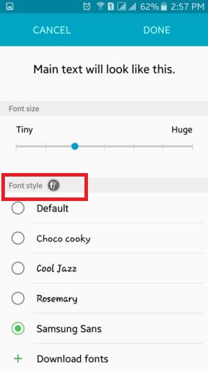 Touch font style and select default, choco cooky, cool jazz, rosemary, or samsung sans.